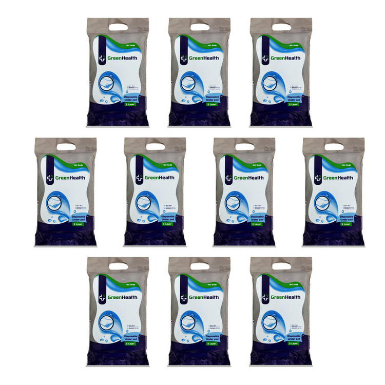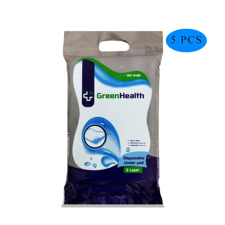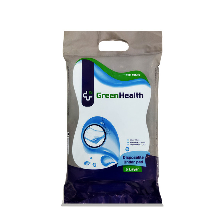 پد زیرانداز بهداشتی یکبار مصرف گرین هلث آنتی باکتریال ،دارای جذب بالا ، ضد حساسیت،تولید ملی و مقاوم در برابر پارگی هست. این محصول برای بیماران ،افراد دارای اختلال ،شب ادراری کودکان کاربرد دارد.مزیت این محصول نسبت به سایر محصولات موجود در بازار 5 لایه بودن آن است . یک لایه پارچه بدون بافت ضد حساسیت ،لایه دوم که از بافت کاغذی برای جذب بهتر،لایه سوم از بافت خمیر کاغذ به همراه پودر جاذب ،لایه چهارم از بافت کاغذی جهت افزایش جذب و لایه آخر از فیلم پلی اتیلن ساخته شده است. از این محصول میتوان برای حیوانات نیز استفاده کرد.تعداد در هر بسته 5 عدد و در مجموع 50 عدد زیراندازه پنج لایه .می باشد.